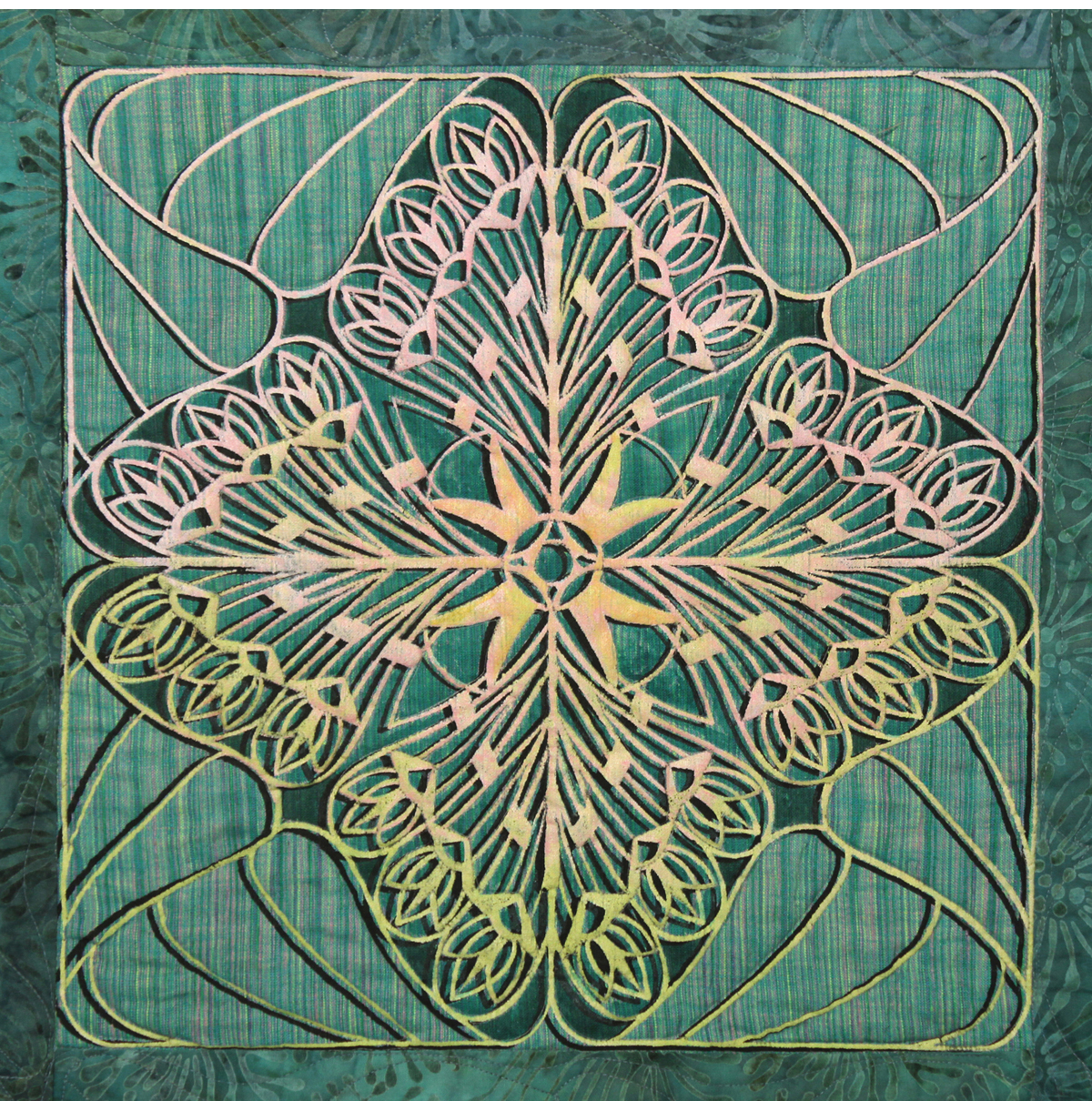 Size: 70" x 76" Inspired by fields of flowers at dusk, artists Ginny Eckley and Susan Ennis chose turquoise tones for the background of their third quilt. Using silkscreen designs, each section is printed and painted, multiple times. Pearlescent paints and layers of color give depth to convey flowers in full bloom at dusk. This artwork is currently on display at Creativity Shell in Kingwood, Texas. |